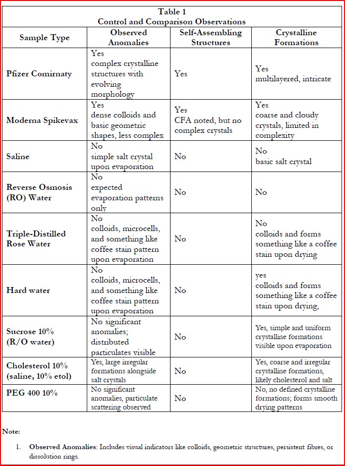 This comparative study reviews anomalies, self-assembling structures, and crystalline formations across various substances including Pfizer’s Comirnaty, Moderna Spikevax, and several controls such as saline, rose water, and PEG solutions. Results indicate complex crystalline and self-assembling structures in the mRNA vaccine samples not observed in the control substances, highlighting significant differences in morphology and behavior.